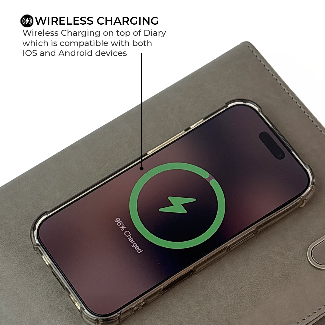 Charge your phone seamlessly on top of the diary — compatible with both iOS and Android devices.